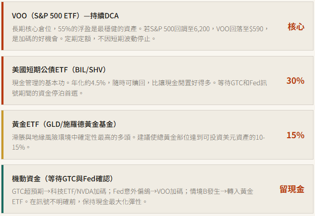 將黃金部位提升至整體可投資資產 20%,台股與美股科技部位減碼至最低核心持倉