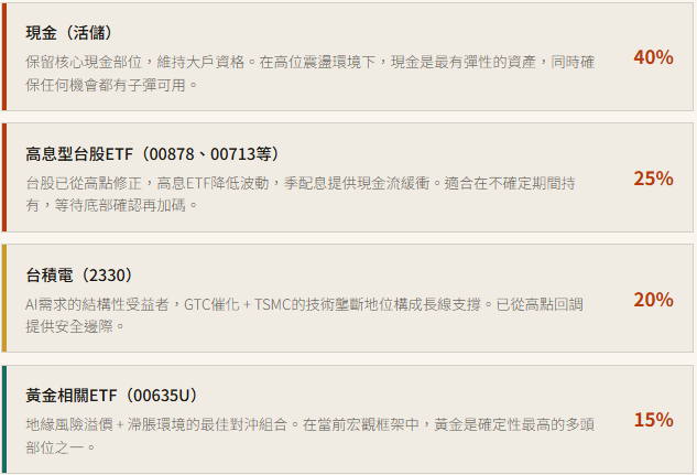 台幣資產:高現金比例 + 防禦性佈局,靜待底部確認