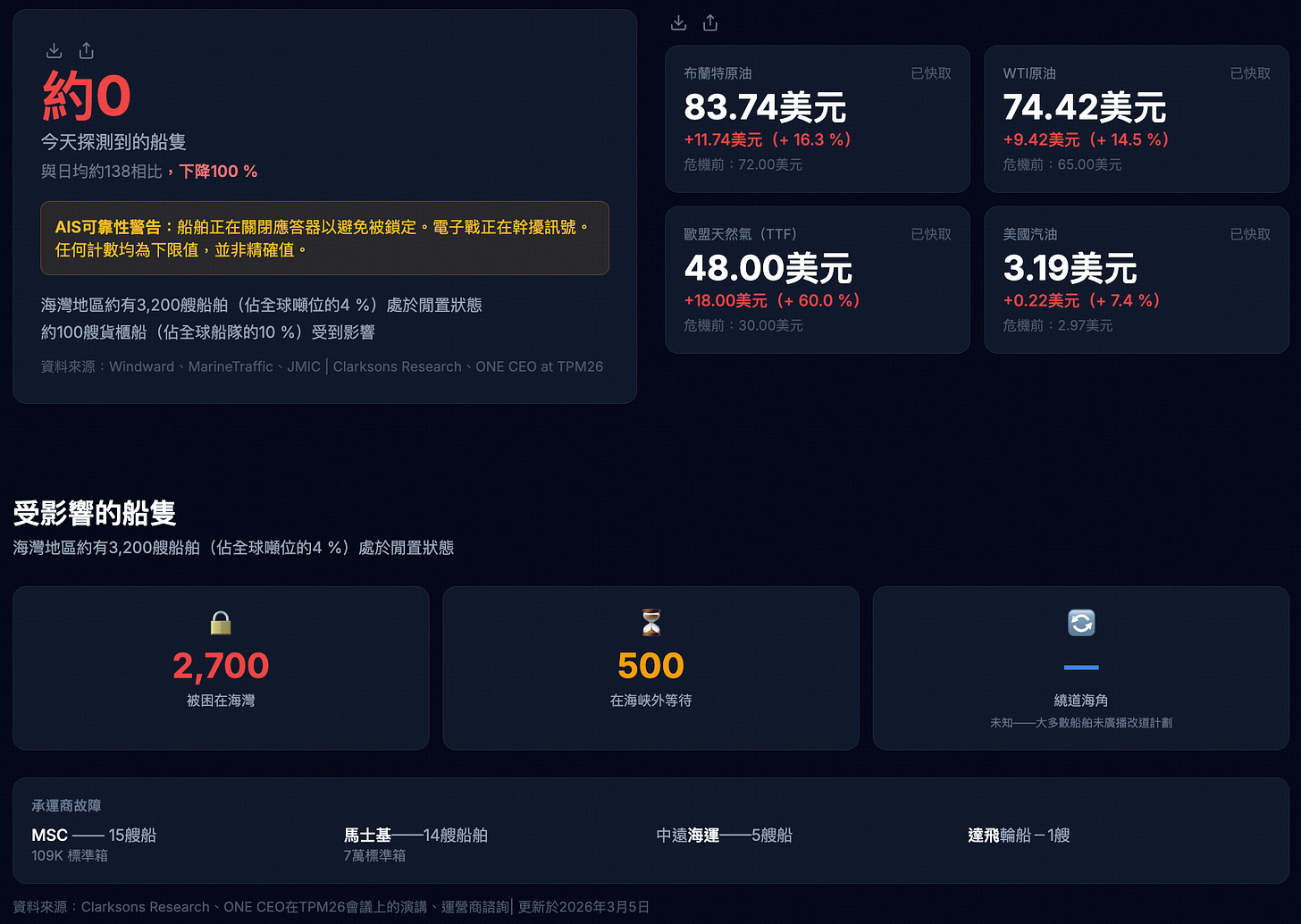 每日情報: Windward (提供精確的每日通行次數統計,如 3/8 僅有 2 艘船通行,較七日均值 5.88 次下降 33%,且兩艘全為伊朗籍