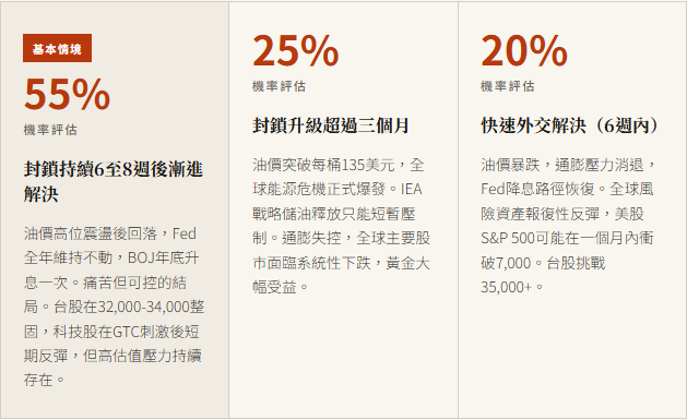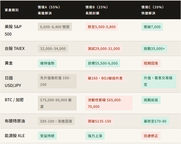 本文提出三個情境:封鎖 6-8 週後解除(55%)、封鎖超過三個月(25%)、快速外交解決(20%),分析各情境對主要資產類別的影響,以及具備台幣、美元、加密資產三種貨幣的投資人可以如何因應。