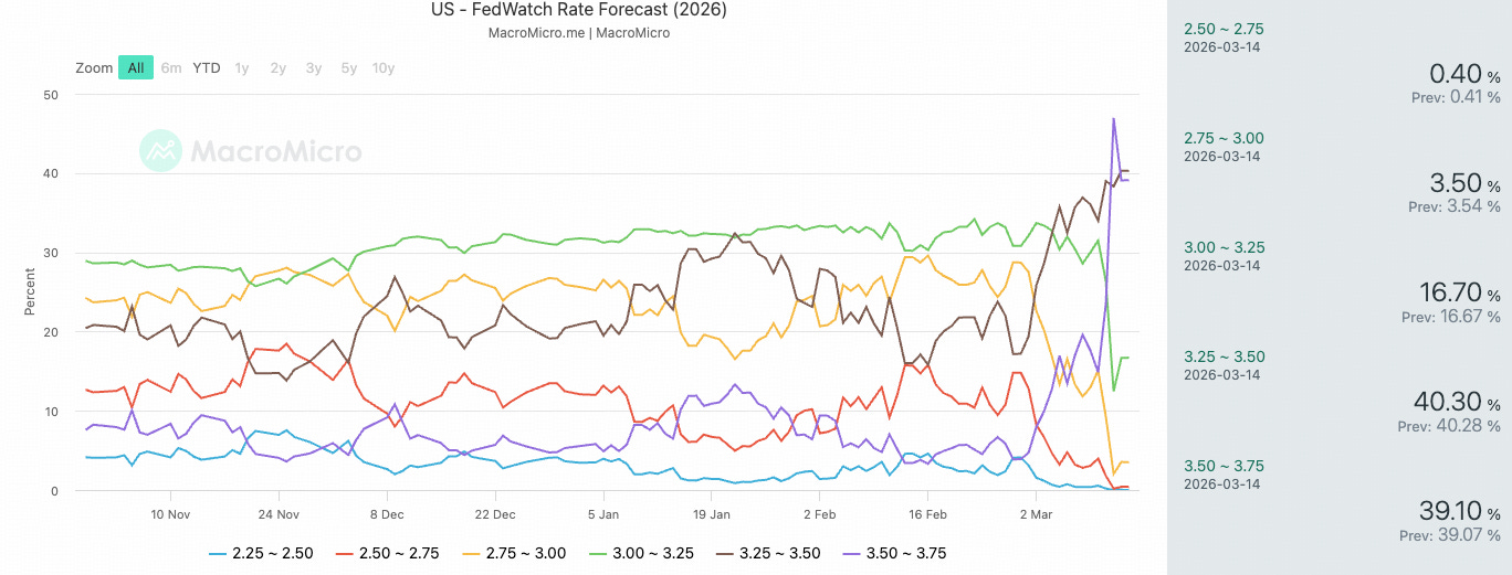 關鍵事實:2026 年全年降息空間已大幅壓縮至25bps以內,聯邦基金期貨市場將 6 月降息機率幾乎歸零。市場當前的共識是 12 月象徵性降息一次,但這個共識的前提是「衝突在8週內解決」若封鎖持續,甚至存在升息的尾部風險。 - FedWatch