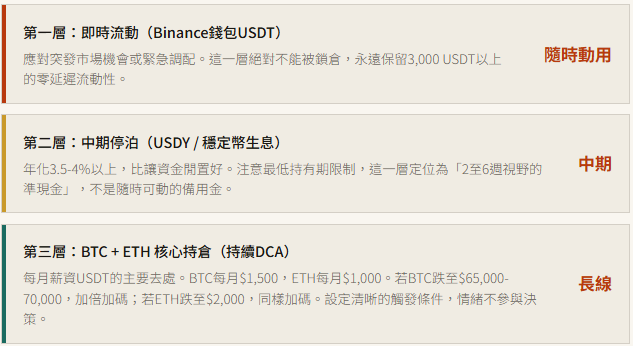加密資產:三層流動性架構 + 保守操作 DCA