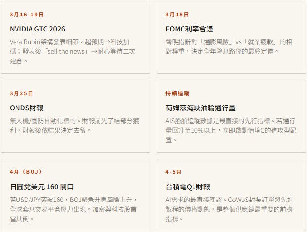 再多的宏觀分析,最終都需要落地為幾個具體的「觀察視窗」。以下是未來一個月最重要的節點,每一個都可能觸發投資組合的再配置,