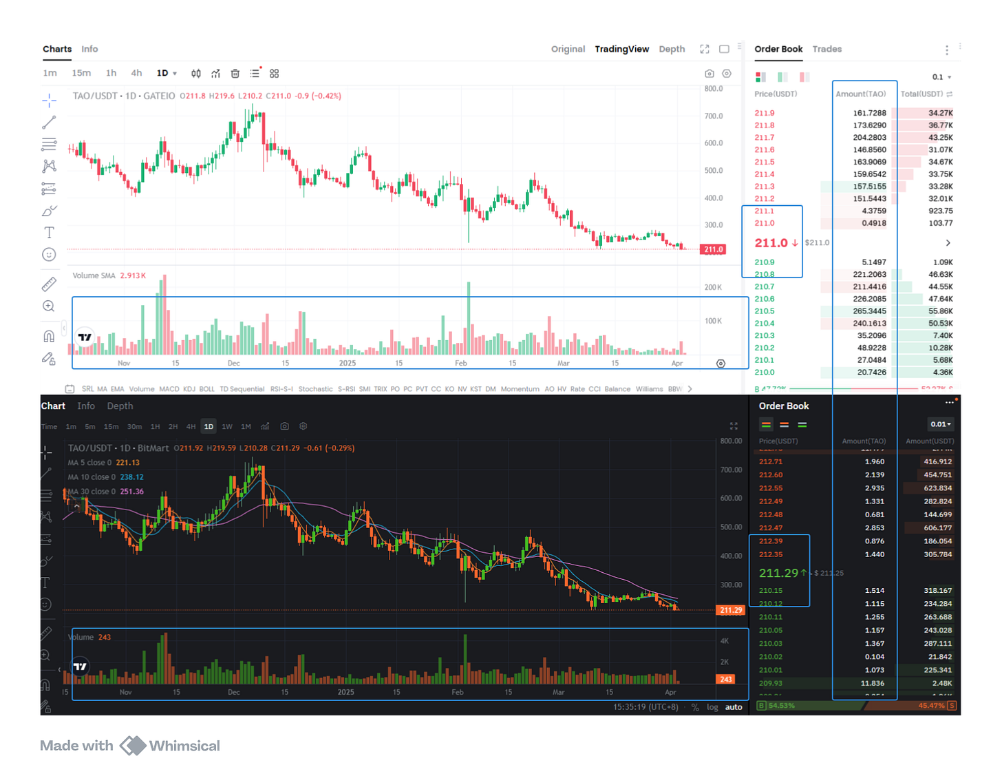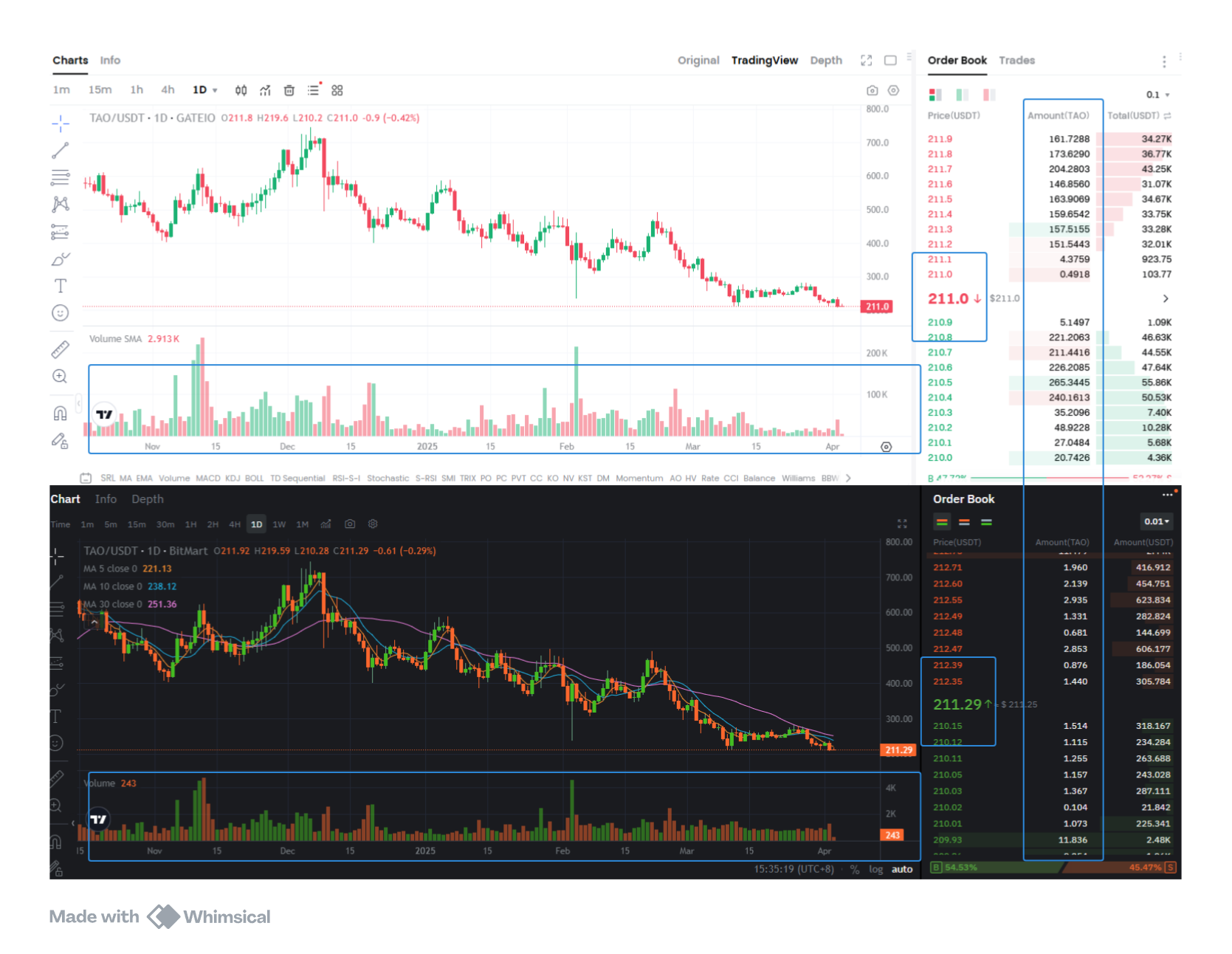 我們可以透過市場深度與滑點直接衡量流動性是否充足,可參考order book的掛單數量(數量越少,越不足)、K線的成交量(總額越小,越不足)、以及成交價上下的價差(差距越寬,越不足),以下舉了兩間交易所的現貨實例比較,可做為參考