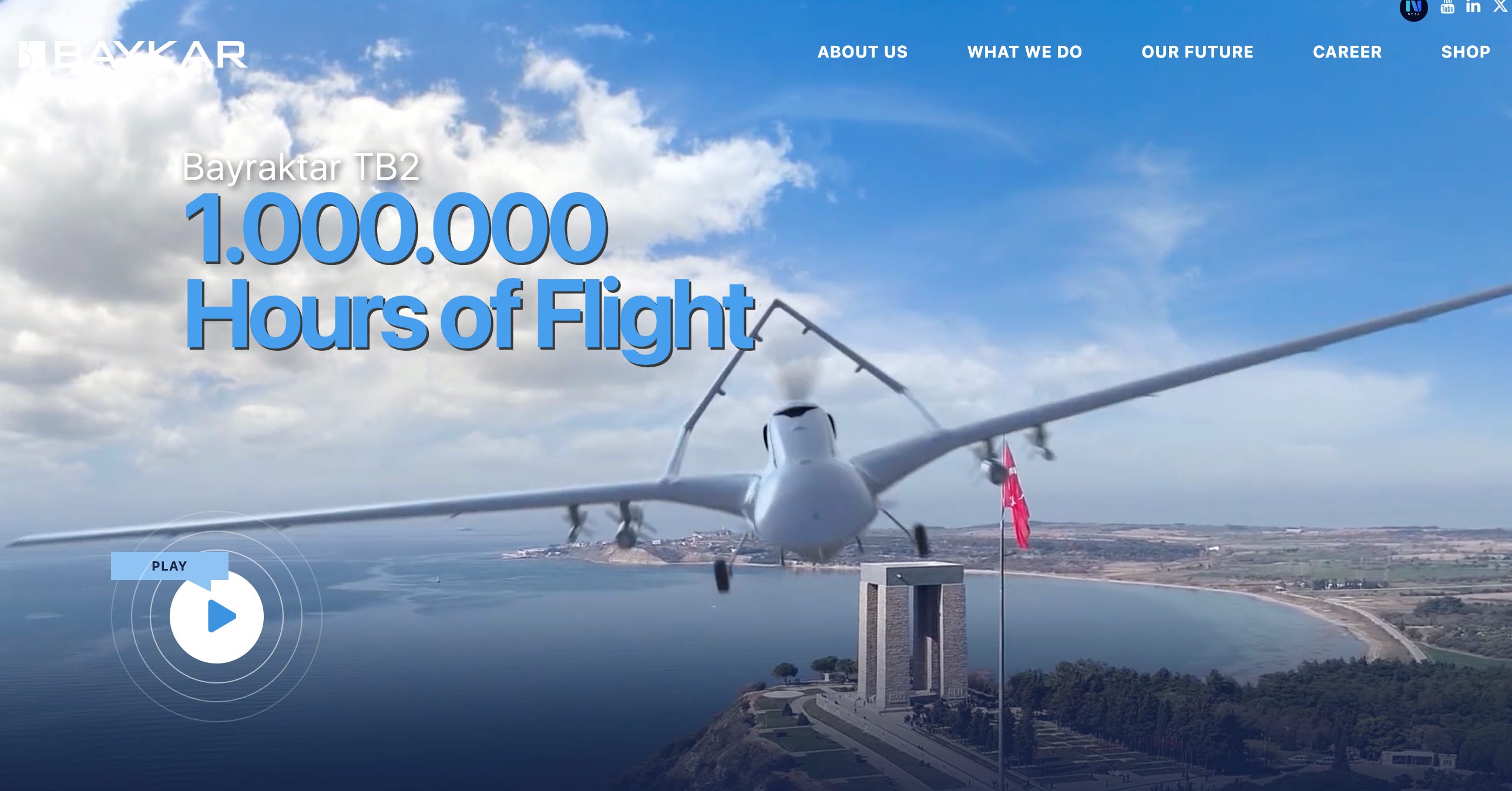 Baykar Defense 公司的 Bayraktar TB2 已出口至33個國家,成為全球最暢銷的軍用無人機之一,翼展12公尺,作戰半徑150公里,可搭載土耳其製 MAM 精確導彈,在敘利亞、利比亞、納卡衝突和烏克蘭戰爭中展現出色戰績,徹底改變了中東的戰爭模式。