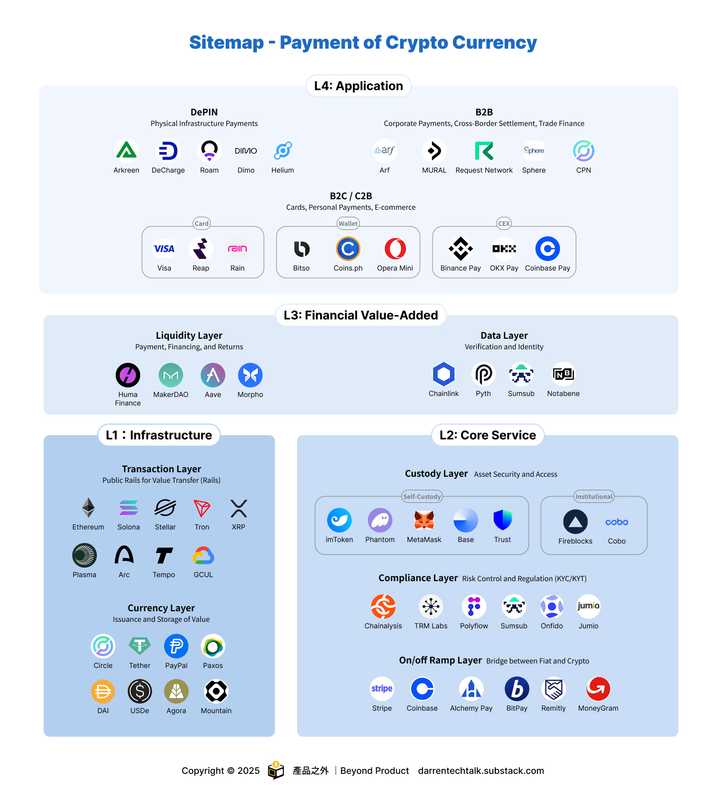 本週乾貨: 公開一張市值 1,700 億美元的「加密支付產業全景圖 (Sitemap)」,解析 L1~L4 的價值堆疊。